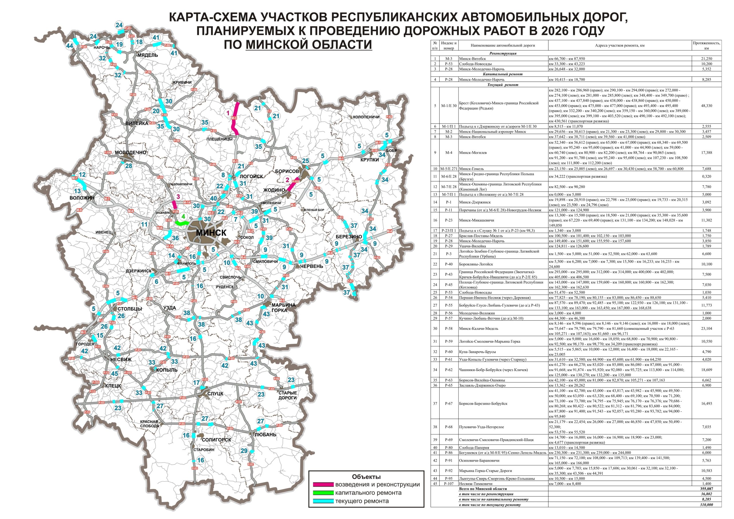Карта-схема ўчасткаў аўтадарог агульнага карыстання, на якіх у 2026 годзе запланавана правядзенне дарожных работ
